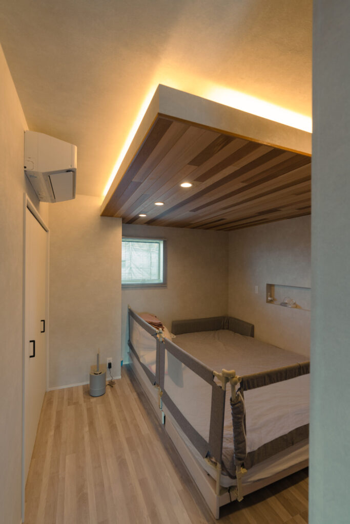 レッドシダーの折下げ天井に間接照明を取り入れた