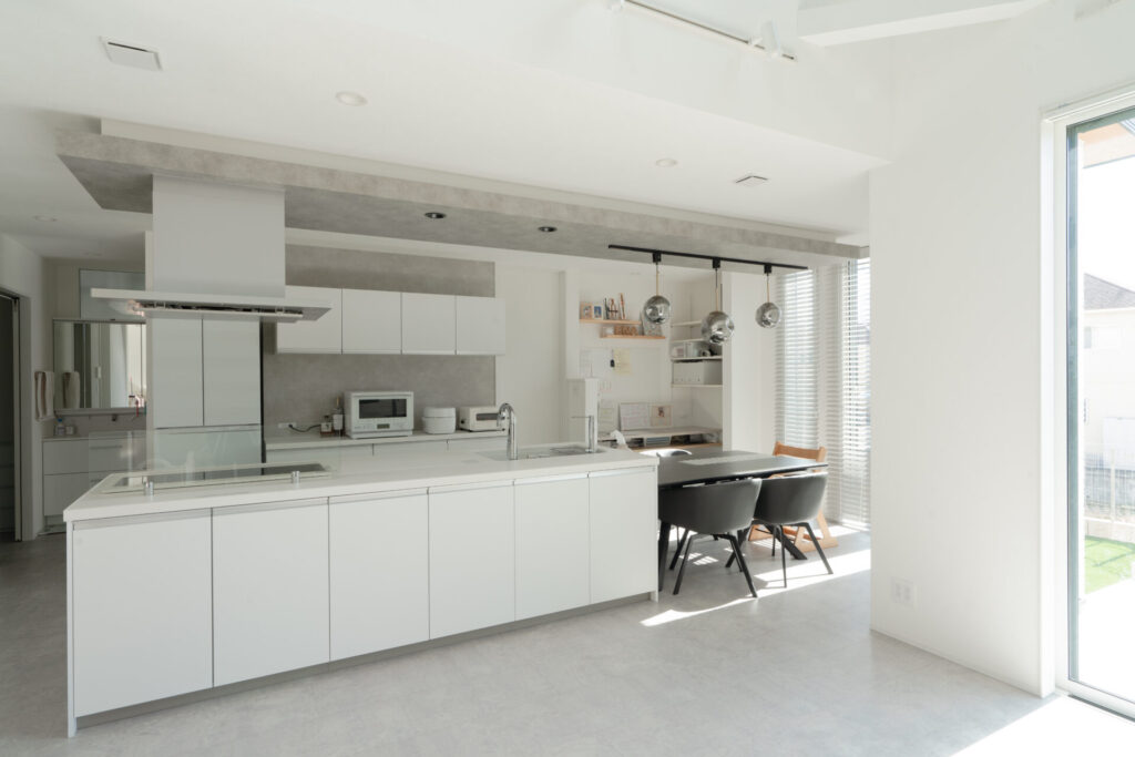 キッチンの後ろ側には水回りが一直線に。