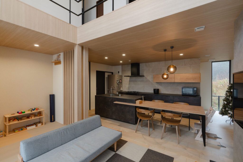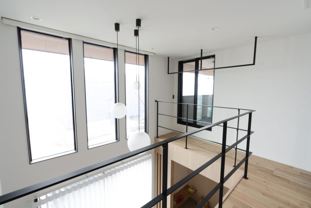 アイアン手すりで二階との繋がりを感じられる開放感抜群の吹き抜け