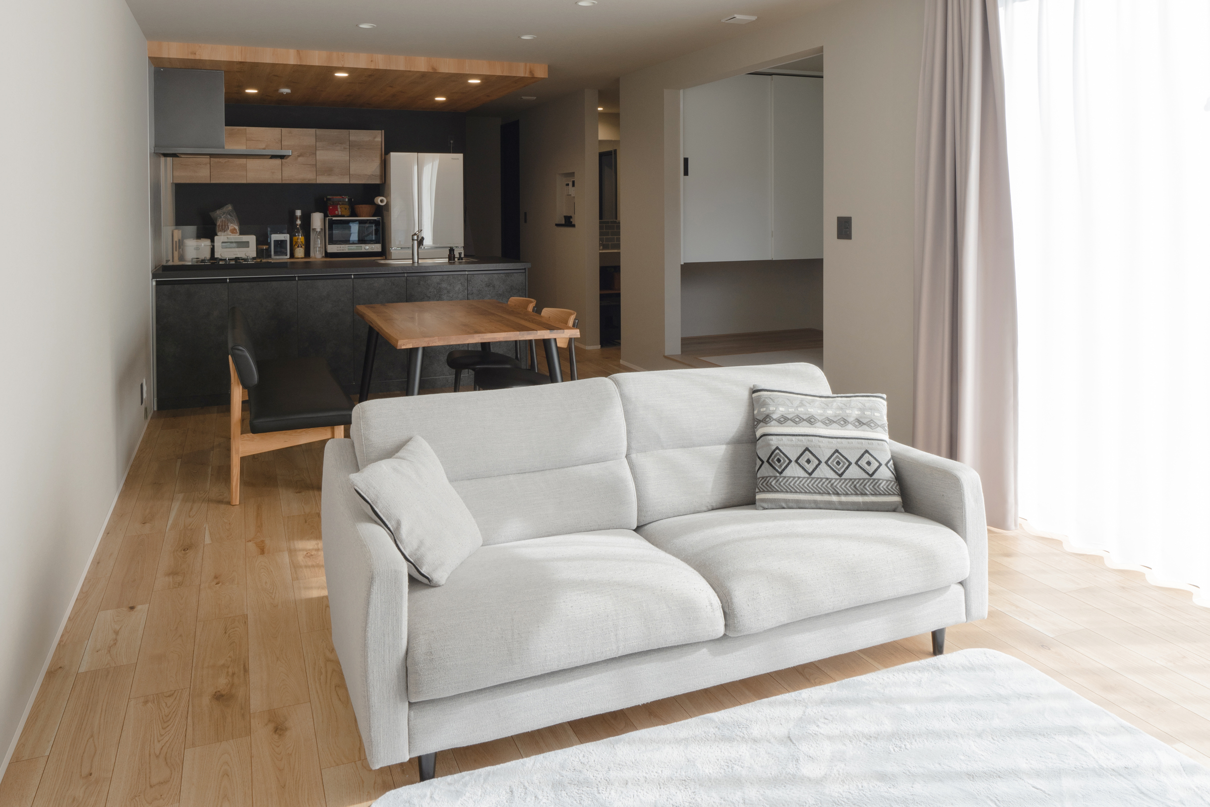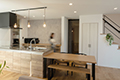 ブラックと木目の調和が美しいキッチンが居心地の良いモダンな佇まい。キッチンからダイニング、リビングを見渡せるI型のLDKはいつでも家族の気配を感じられます。キッチンの裏側には3畳の収納スペースがありパントリーとしても、クローゼットとしても使用可能。1階に収納を設けることにより、見えている部分はいつでも綺麗に保てます。ダイニング隣に設けた小上がりの畳スペースは、ロールスクリーンで仕切ることで来客時のゲストルームへと早変わりします。