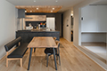 結婚を機にマイホームを建てたいと言うご相談を頂いたN様。一番のご要望は『開放感のある大きなお家を建てるのが夢』と言う事で、土地探しの段階からサポートさせて頂きました。27.5 帖のLDK に更に開放感を持たせるためにハーフ吹抜けを採用したり、間仕切りを設けない5 帖の和コーナーを続き間で配置するなどより広く感じられる工夫を加えたプランニングになっております。暗く感じがちになる黒基調のインテリアも木目の差し色や間接照明による補助光を取り入れる事で明るく感じられる工夫がなさせれおります。