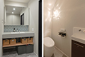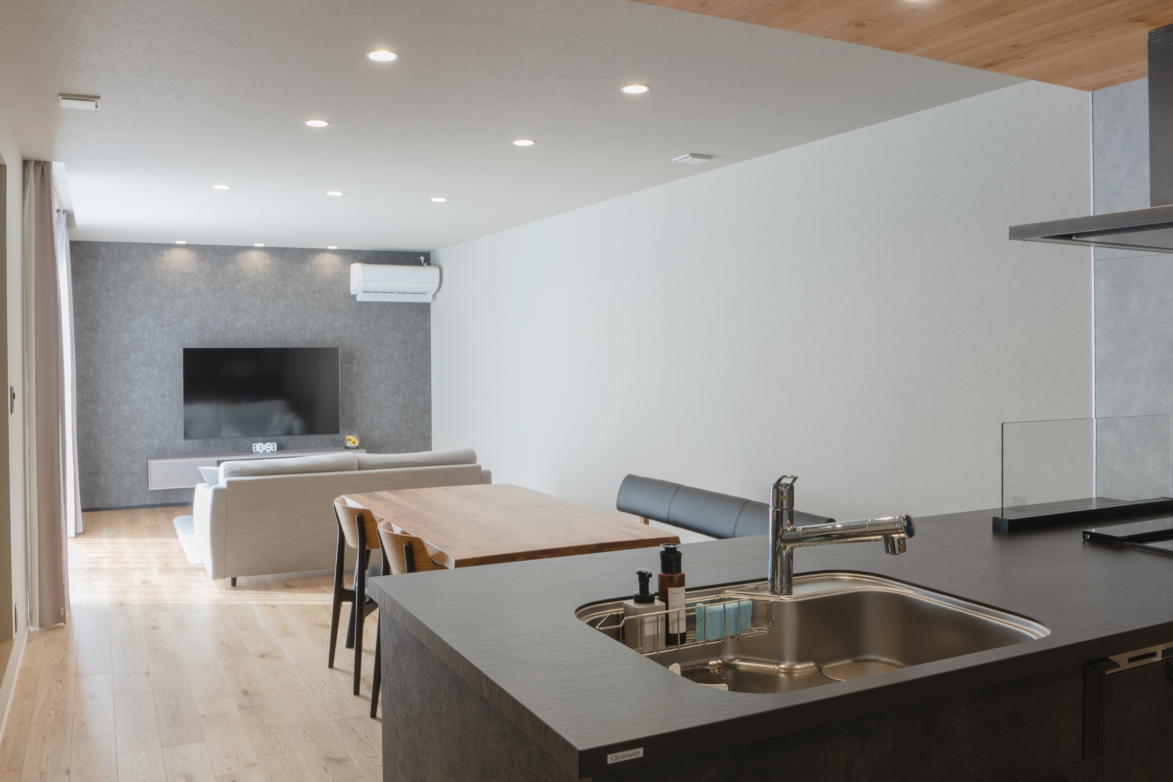 玄関ドアを開けるとかっこいいブラックのタイルがお出迎え。アイアン手すりの階段やガラスドアから見えるかっこいいキッチンが非日常的な空間を演出しています。全体的にグレーやブラックで統一された落ち着きのあるカラーバランス。リビング上は天井を高くし、開放的な空間に。木目調クロスやタイル、間接照明がアクセントになり、デザイン性の高いLDKを実現しました。造作洗面にも間接照明を施工。お家全体がホテルライクでハイセンスな空間に仕上がりました。