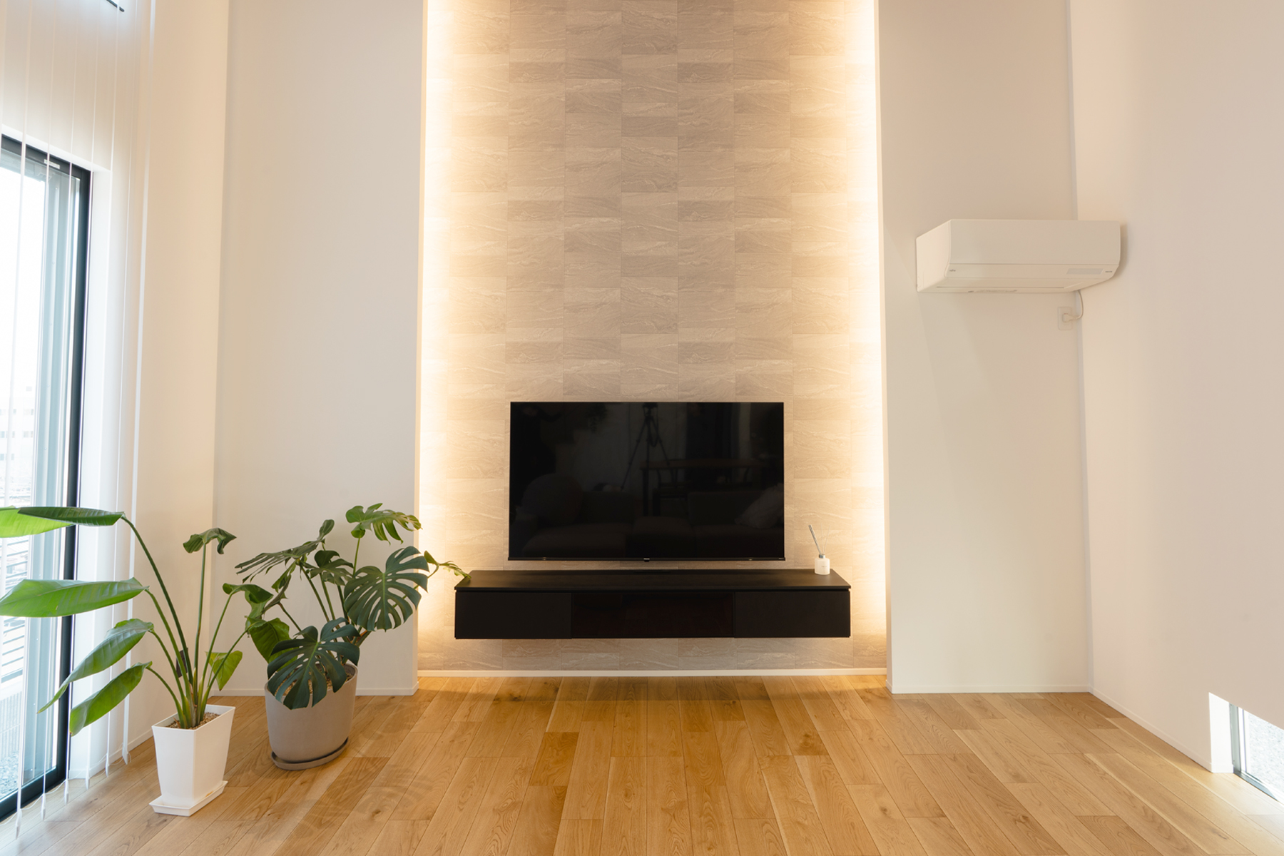 ハーフ吹き抜けを採用したリビングは明るく開放感も抜群。テレビ背面に施工した2本の間接照明が非日常的な空間を演出しています。L字のLDKを採用されたY様邸。キッチンの向かいにも窓を採用し明るい光が差し込み、お料理をしながら外を眺めることができます。また、階段をリビング内に配置することにより、いつでも家族の気配を感じられます。空間を最大限活用した無駄のない間取りです。